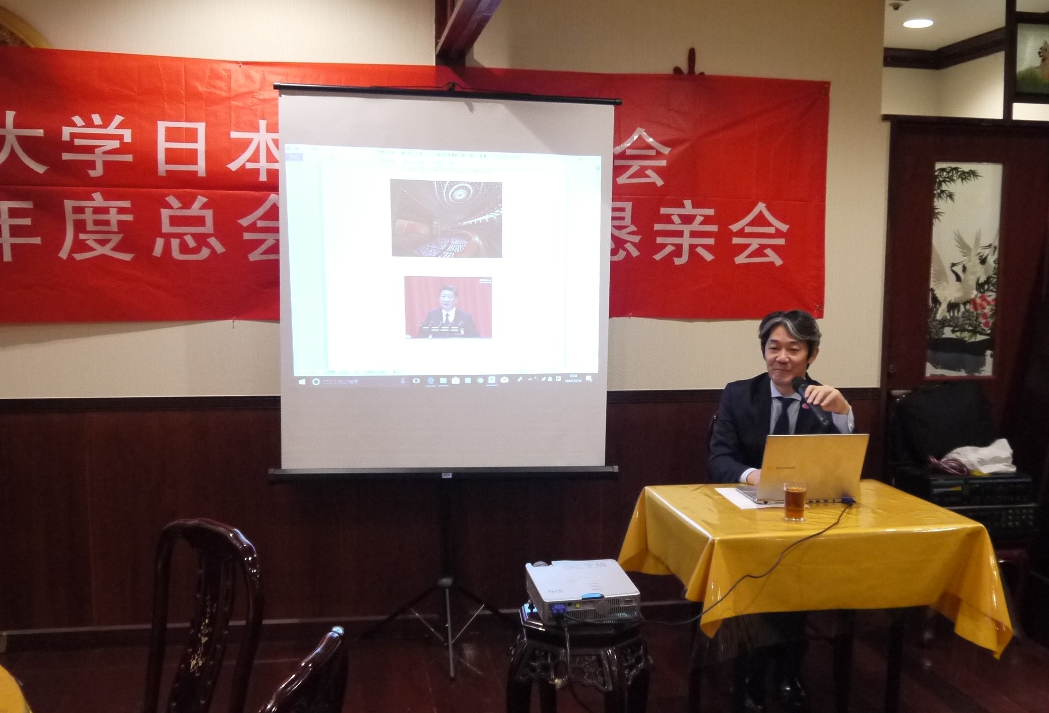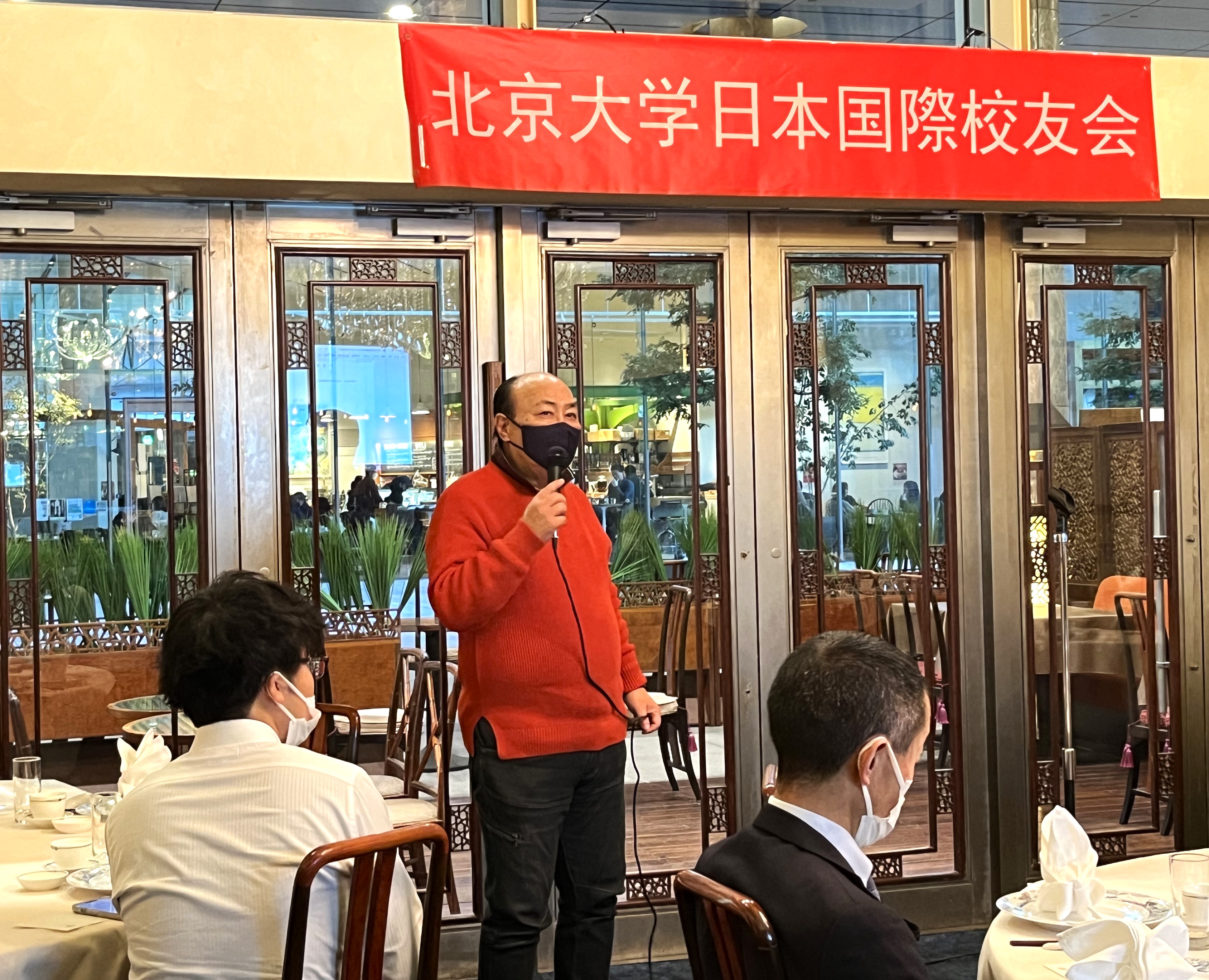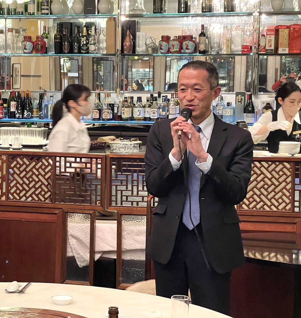 次に堀江会長から乾杯の挨拶がされ、初めて参加にされた方々に本校友会について紹介し、講演者の北京大学前常務副学長呉志攀氏や、三菱商事株式会社執行役員・東アジア統括平井康光氏に対して感謝の気持ちを伝えました。