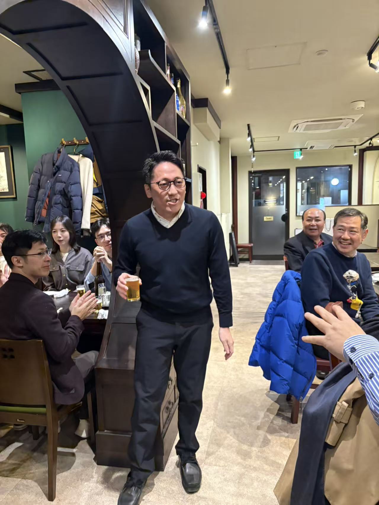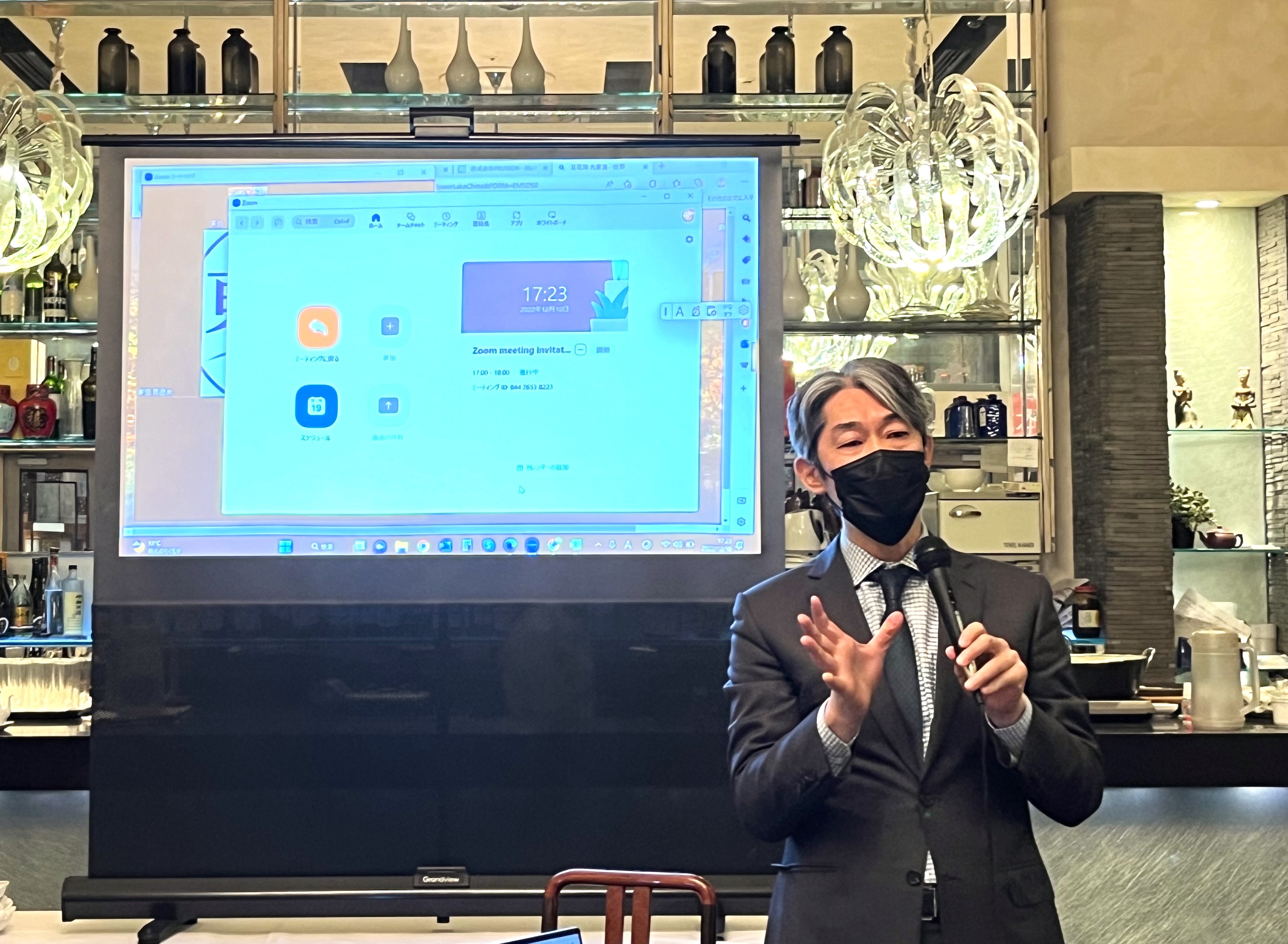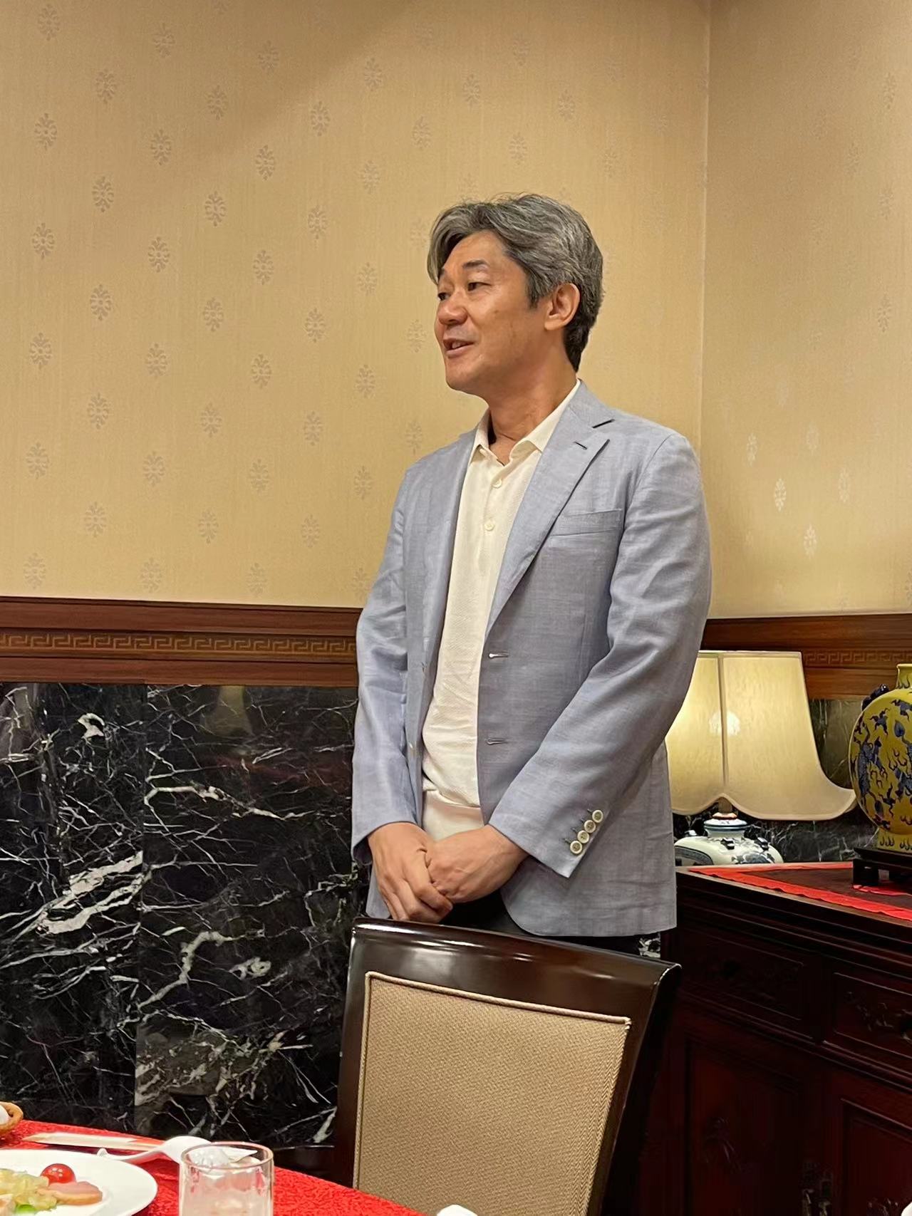 次に堀江会長から乾杯の挨拶がされ、初めて参加にされた方々に本校友会について紹介し、講演者の北京大学前常務副学長呉志攀氏や、三菱商事株式会社執行役員・東アジア統括平井康光氏に対して感謝の気持ちを伝えました。