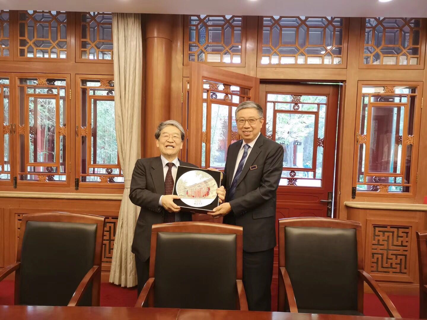 このたび、北京大学日本国際校友会設立の報告と今後の交流深化のために同大学を表敬訪問したものですが、国際交流の責任者である李副学長と夏国際合作部々長が実務担当者二人を従えて、同大学キャンパス内の臨湖軒で我々一行を迎えてくださいました。(臨湖軒は由緒ある未明湖畔に建つ同大学の迎賓館です。)