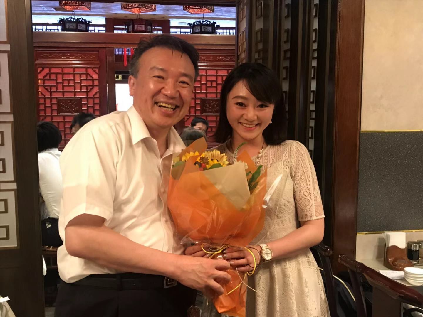 懇親会の終盤では北京に赴任される岡田様へ校友会より花束が送られました。