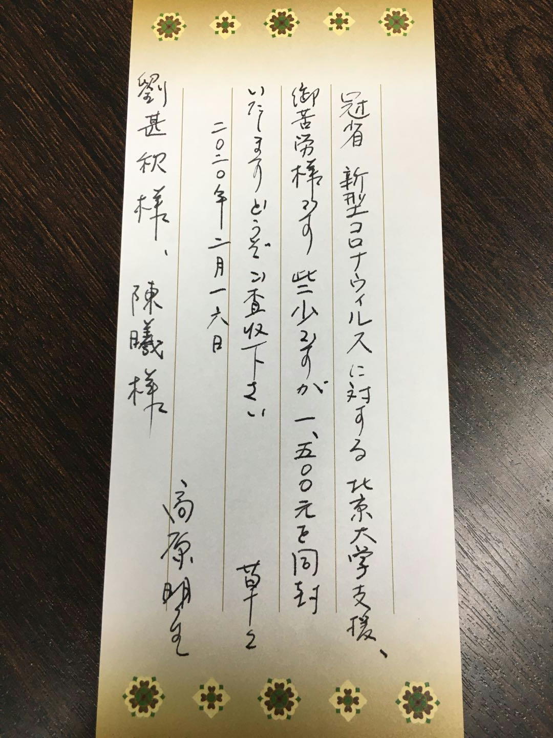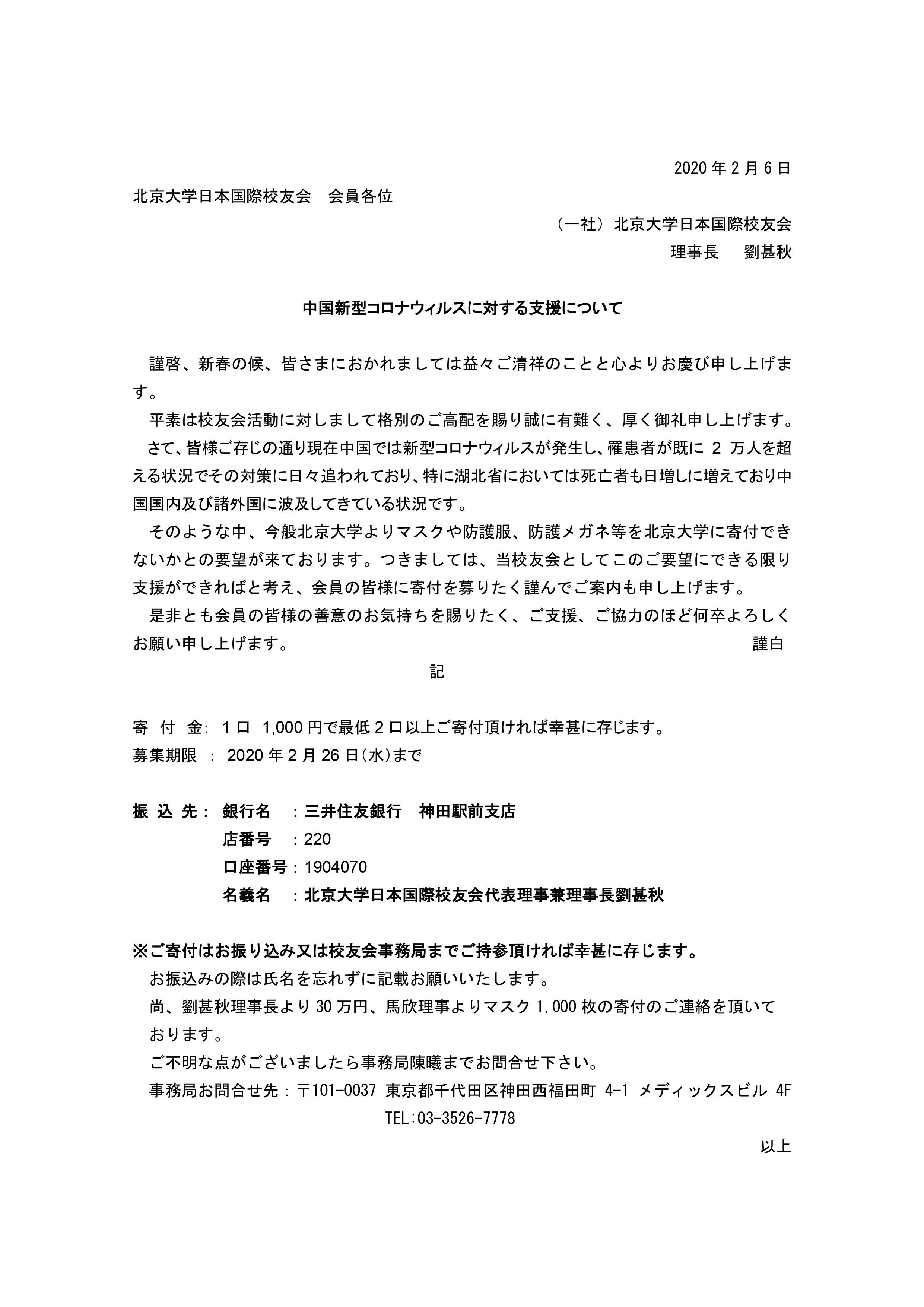 1月末、中国では新型コロナウィルスが爆発的に発生し、感染者数が日に増えている中、日本にいる校友会の会員から、何とかして力になりたいという声が上がってきています。臨時理事会を急きょ開き、会員向け寄付の呼びかけをしました。
