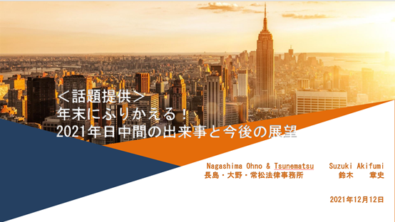 総会の最後に理事公選を行い、吉田圭一郎氏(MRTインターナショナル 株式会社)、杜亦軒氏(三井住友信託銀行)、岡田勝氏(外務省)、鈴木章史氏(長島・大野・常松法律事務所)4名の立候補者に対し、全会一致で賛成され、新理事4名が選出されました。