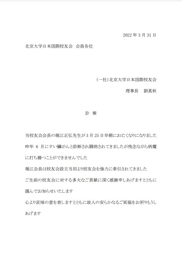 さて、北京大学日本国際校友会が昨年12月に設立されてから約1年が経過しようとしております。おかげさまで新たに当校友会に加入される方が日増しに増えてきており、これは会員の皆さまのご支援とご協力のおかげであり心から感謝申し上げます。