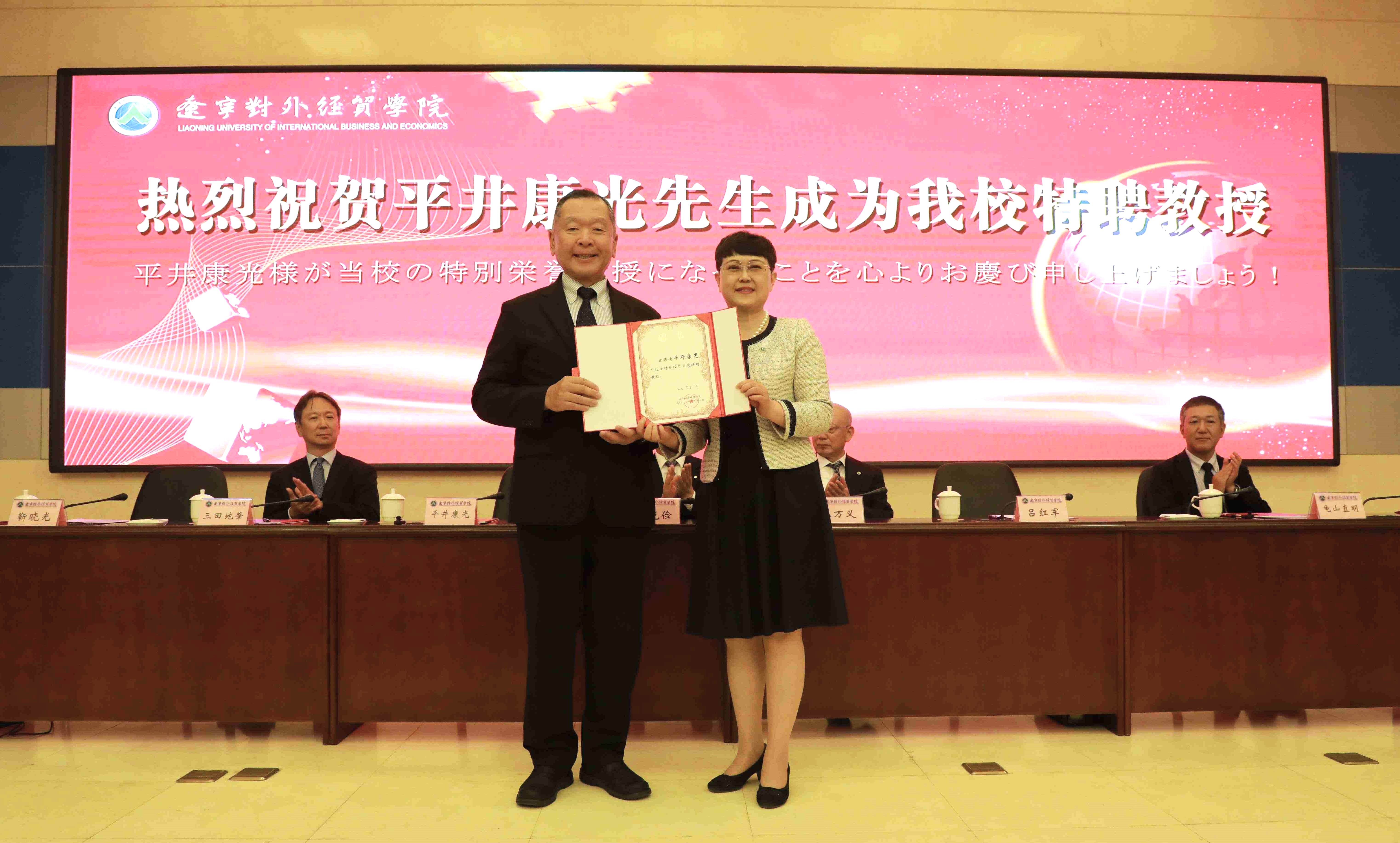 記念撮影。左二は李岩松副学長、真ん中は国際校友会劉理事長。